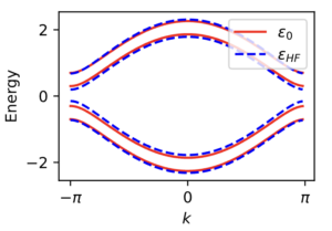 Hartree-Fock is a standard tool in the study of electronic correlations in the presence of interactions. The method decomposes four-point interactions into a product of a two-point function and a mean field expectation value of a two-point functions. This is the essence of the variational ansatz: it assumes that Wick’s theorem holds and then optimizes over states for which Wick’s theorem holds (Slater determinants). The value of the mean fields are determined self-consistently from an initial guess of their values and an iteration given the current updated values and the Hamiltonian. See the figure below for the convergence and Hartree-Fock bands (minus the Hartree shift) as detailed in my first notebook.