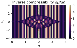 Now, the key benefit of Hartree-Fock is that it can treat large systems quickly without succumbing to the exponential scaling of exact diagonalization. This speed can be utilized to quickly calculate observables such as the (inverse) compressibility where interactions lead to incompressible states at rational fillings