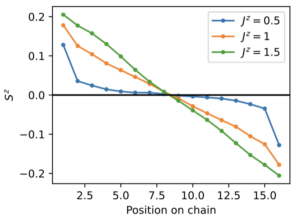 Figure: steady state magnetization in a boundary driven 16-site Heisenberg XXZ spin chain exhibiting ballistic (Jz=0.5), superdiffusive (Jz=1), and diffusive (Jz=1.5) spin transport.