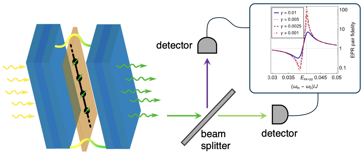 Embedding materials in cavities is a promising route to engineer materials properties through altering their electromagnetic environment. This has resulted in observations of cavity-induced metal-insulator transitions, nematic orderings, and enhancement/destruction of (fractional) quantum Hall states. Within this context it is natural to ask the dual question: what does embedding materials in a cavity do to the transmitted light upon driving? For single emitters this is well known where the Jaynes-Cummings model describes coupling a single emitter to a single cavity photon mode. For extended materials this is less well known. With Benjamin Kass, Ajit Srivastava and Martin Claassen we began to address this question by showing that (1) extended materials can exhibit single photon generation with a large light-matter cross-section dependent on the distance of the material to a quantum critical point, and (2) product states of photons can become entangled EPR pairs (Bell pairs) of photons provided the input frequency and polarization are carefully controlled and the material has specific crystalline symmetries. The work is documented in arxiv:2411.08964 (2024), and we plan follow-up works soon.